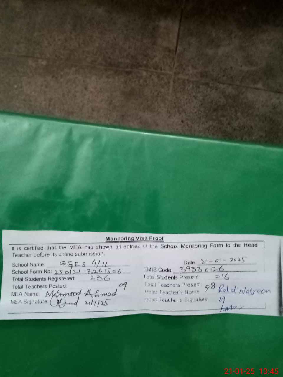 | Attendance Register | Head Teacher | MEA with School | Visit Proof |