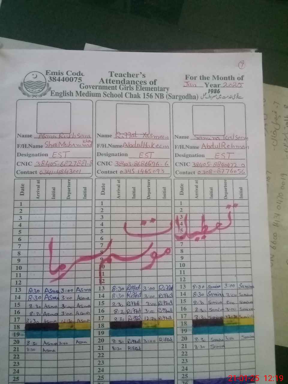 | CNIC | Full Name | Designation | R/C | Absence during last cal. month |