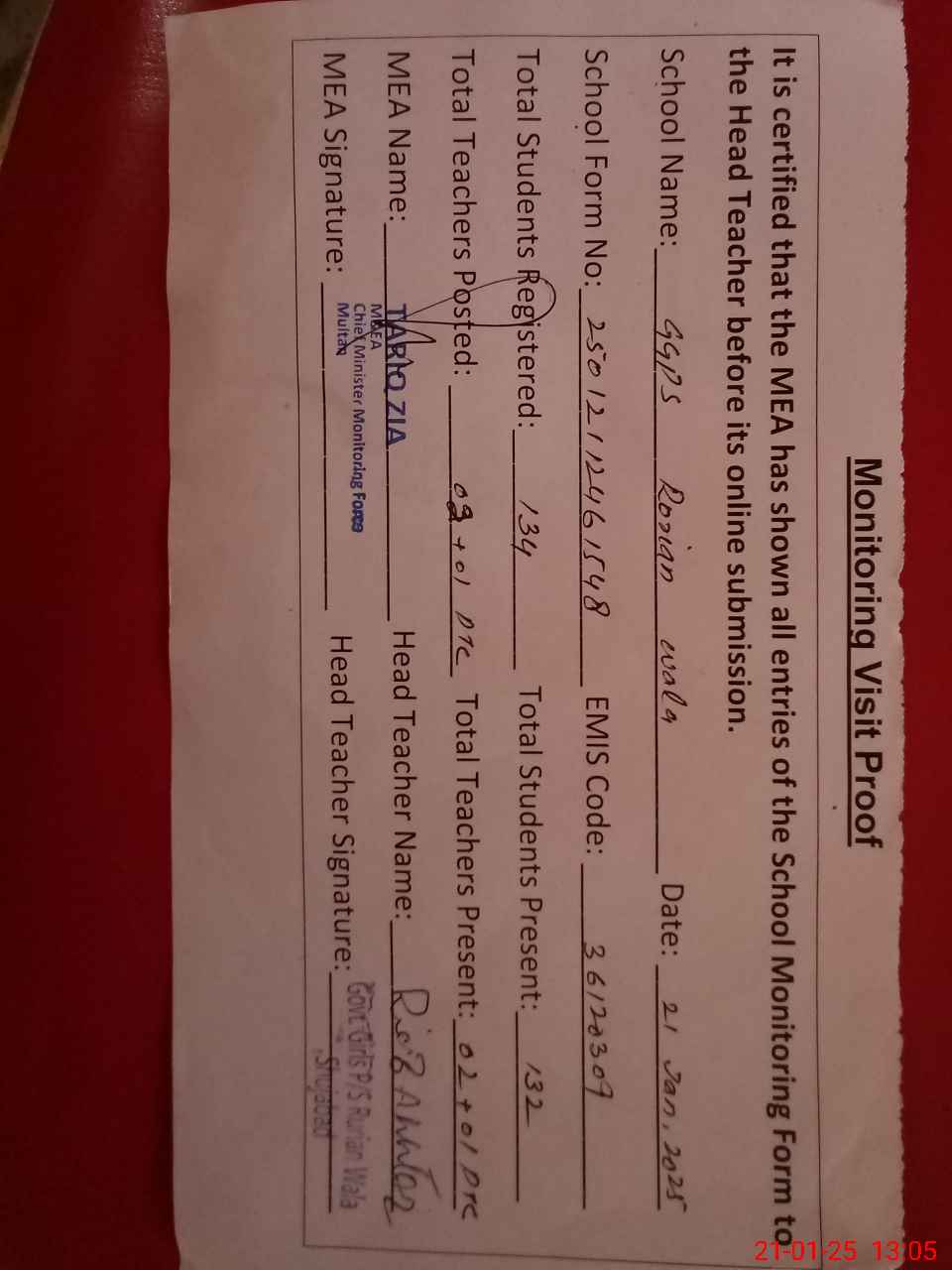 | Attendance Register | Head Teacher | MEA with School | Visit Proof |