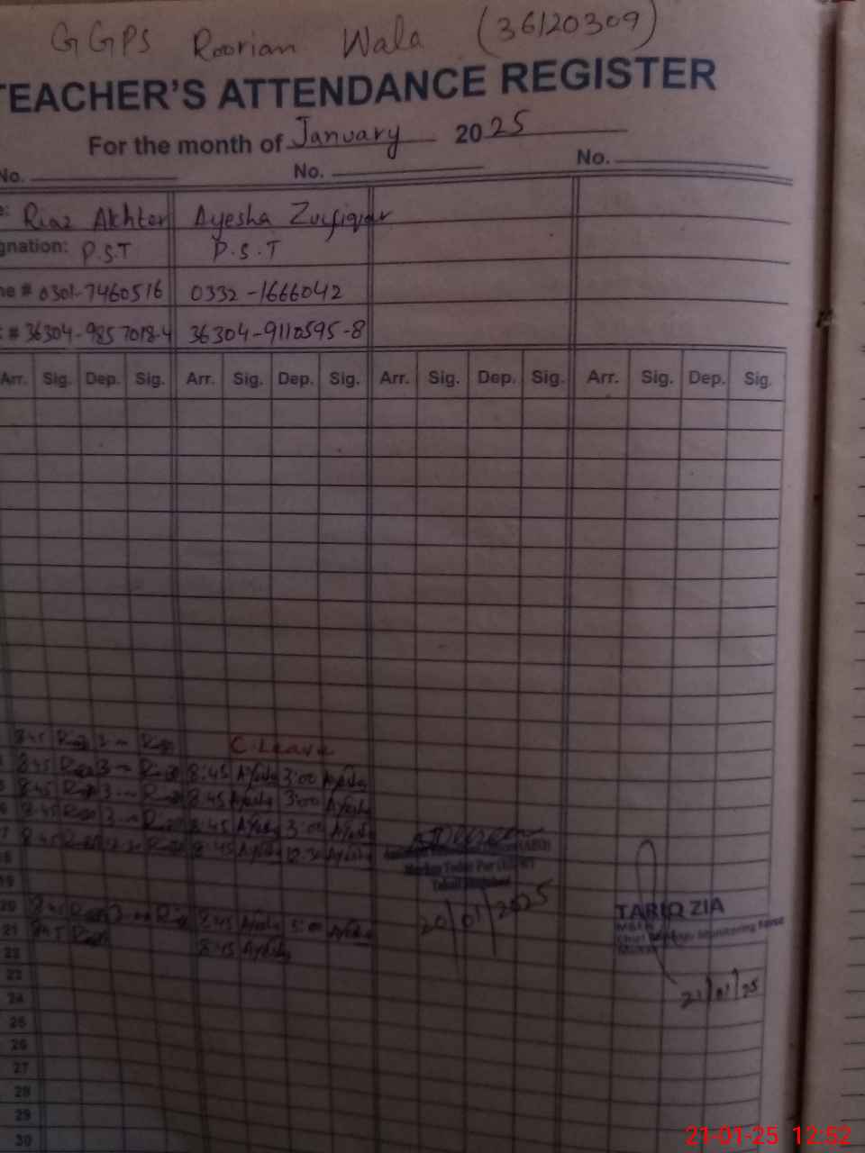 | Remarks (Use Separate Page if Required): NSB register na Morning attendance according to roznamcha Afternoon presence marked with headcount | |||||