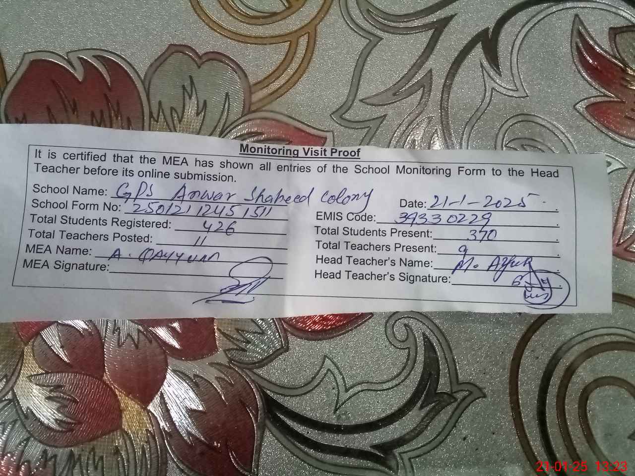 | EMIS Code: 39330229 | Name of School: GPS ANWAR SHAHEED COLONY | |||