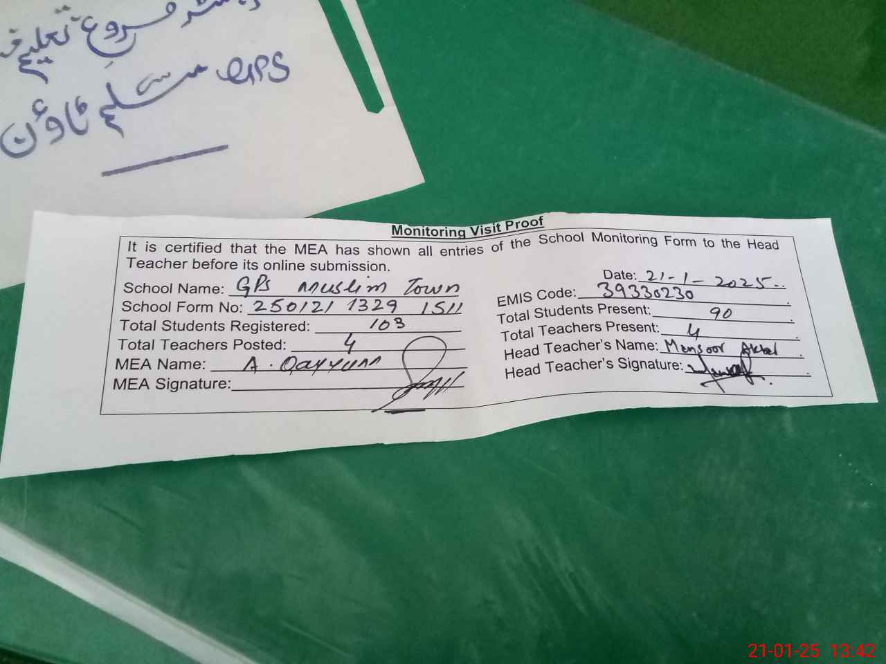 | Attendance Register | Head Teacher | MEA with School | Visit Proof |