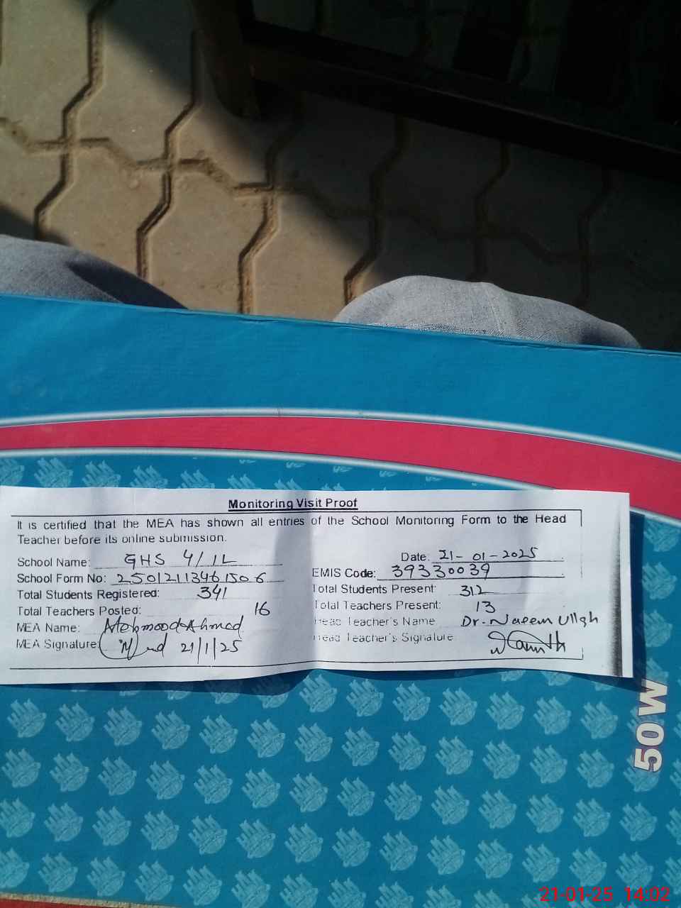 | Attendance Register | Head Teacher | MEA with School | Visit Proof |