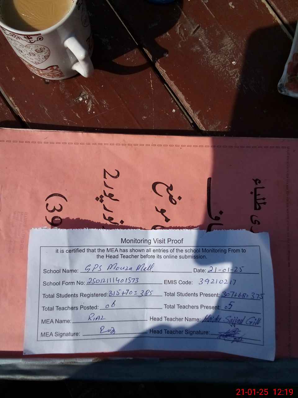 | Attendance Register | Head Teacher | MEA with School | Visit Proof |