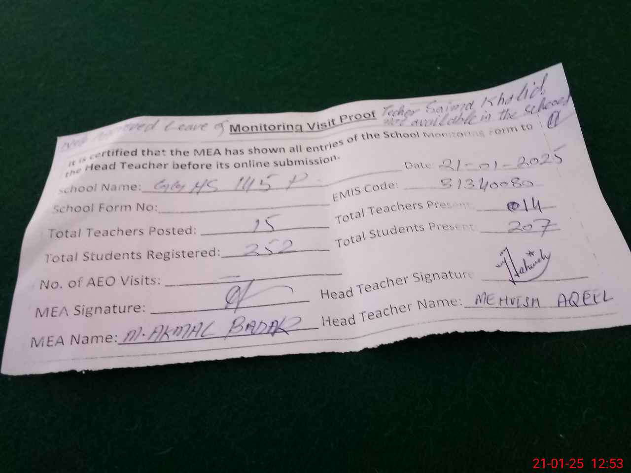 | Attendance Register | Head Teacher | MEA with School | Visit Proof |