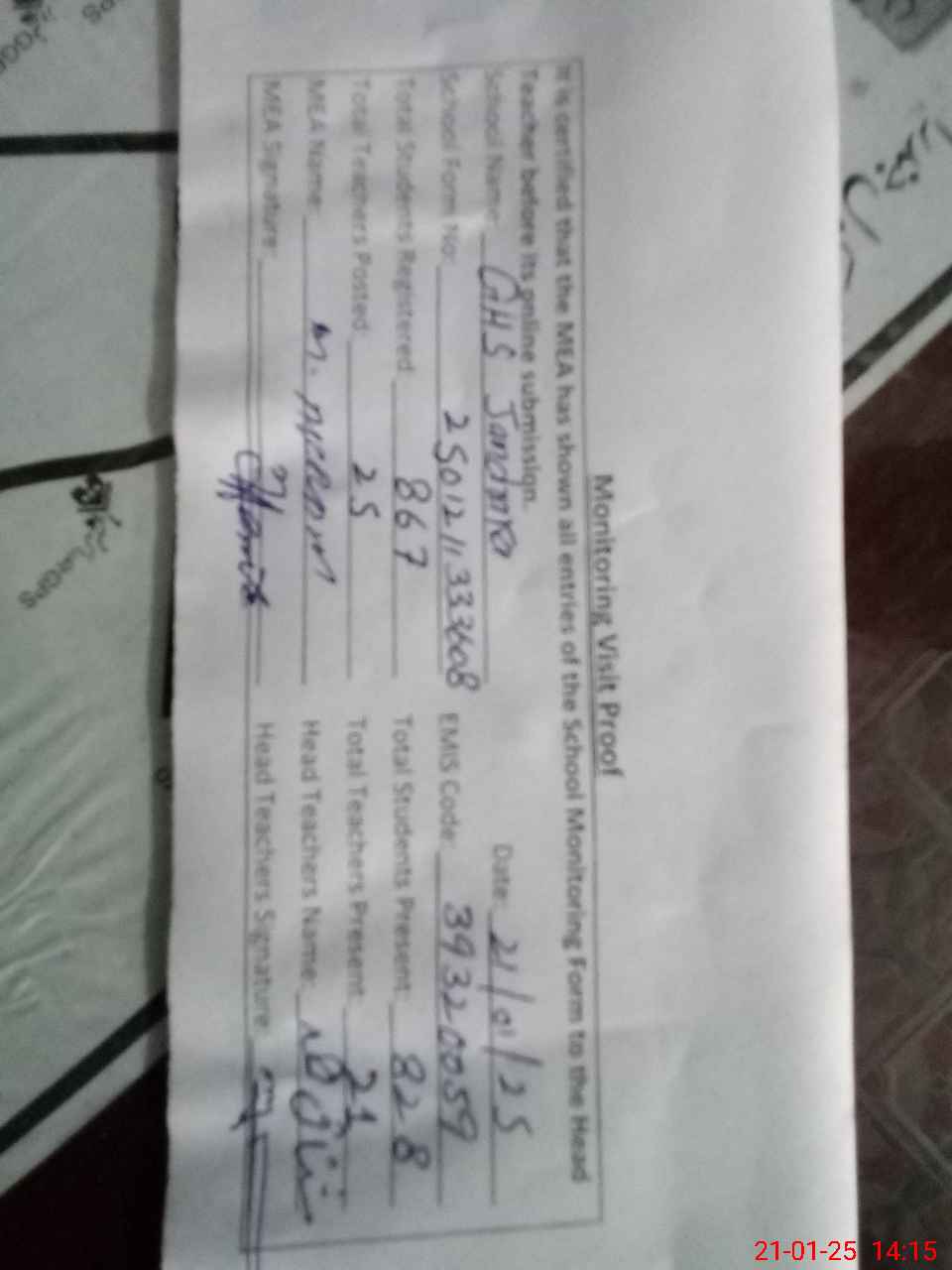 | Attendance Register | Head Teacher | MEA with School | Visit Proof |