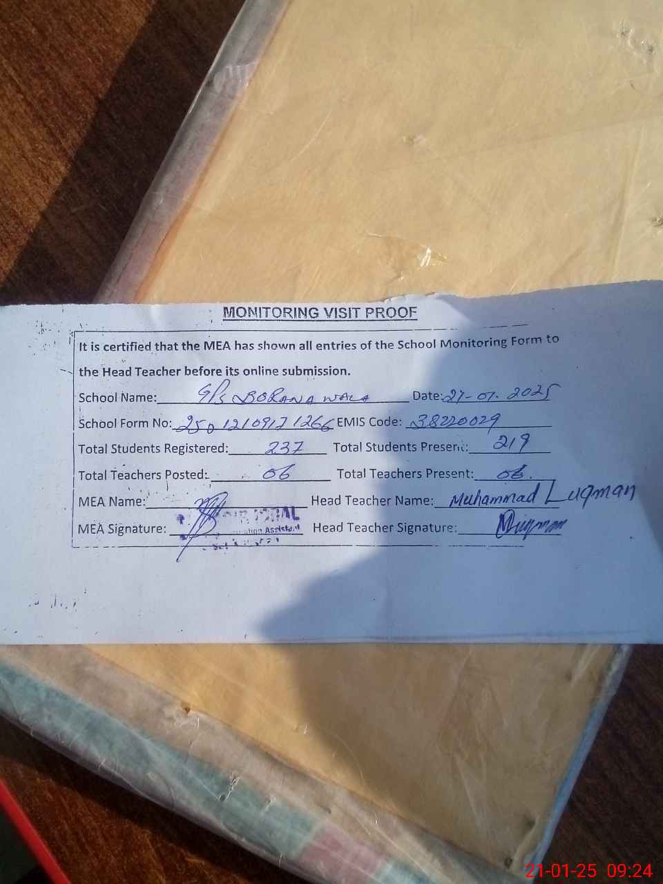 | Attendance Register | Head Teacher | MEA with School | Visit Proof |