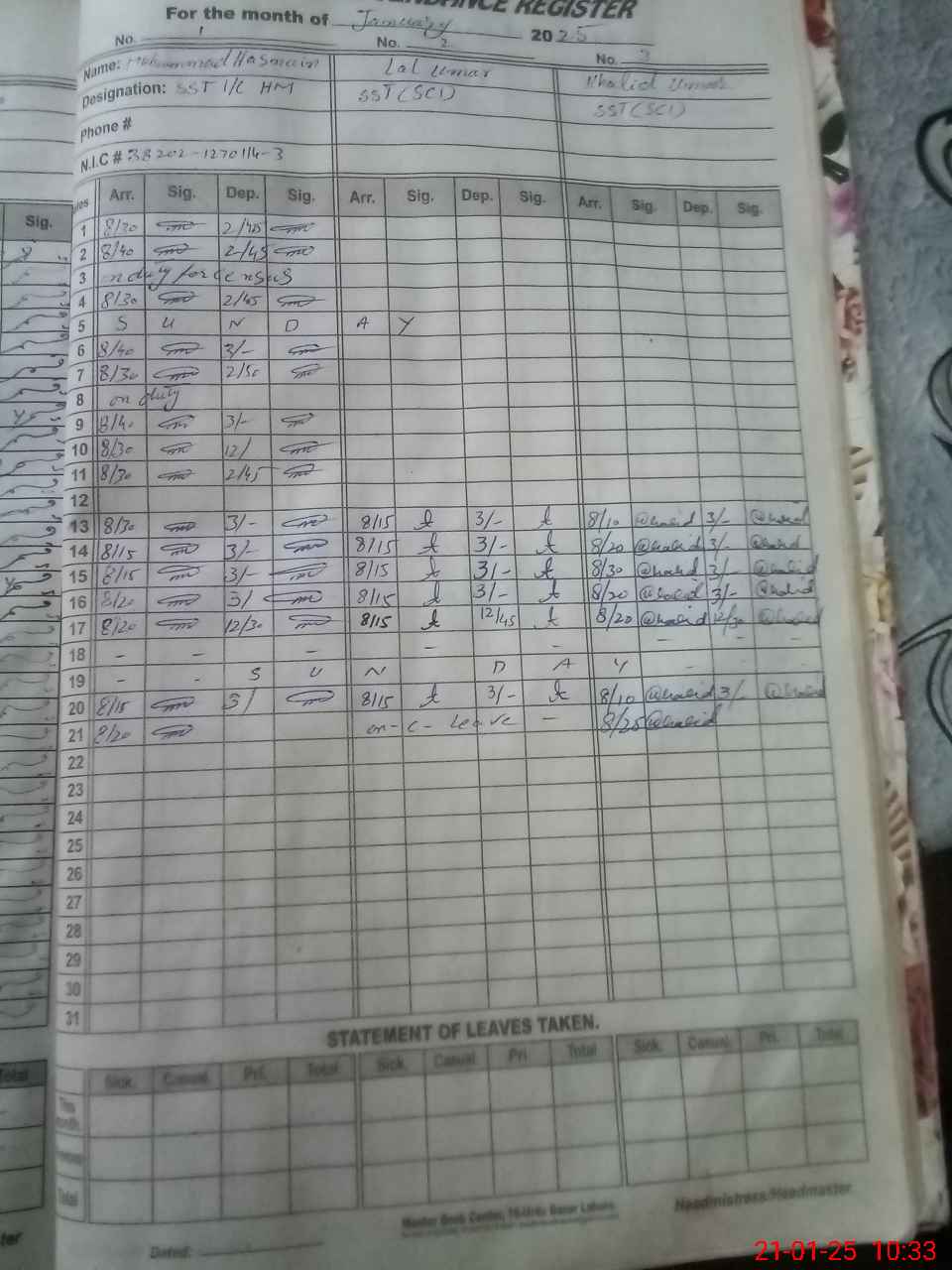 | CNIC | Full Name | Designation | R/C | Absence During Last Calender Month |