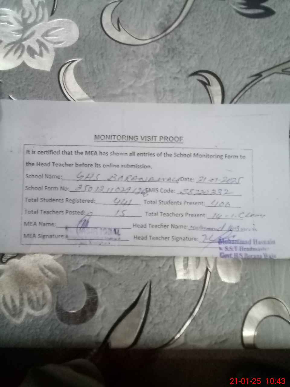 | Certified that this School was Inspected by the Undersigned MEA/DMO Today and the Information Stated Above is as Per Record. | |||||