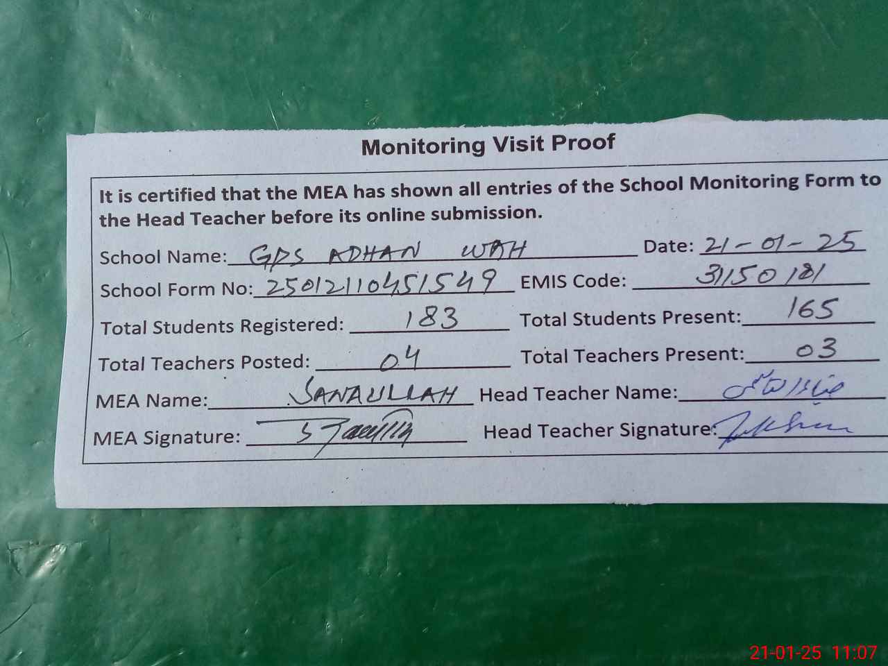 | EMIS Code: 31150181 | Name of School: GPS ADHAN WAH | |||