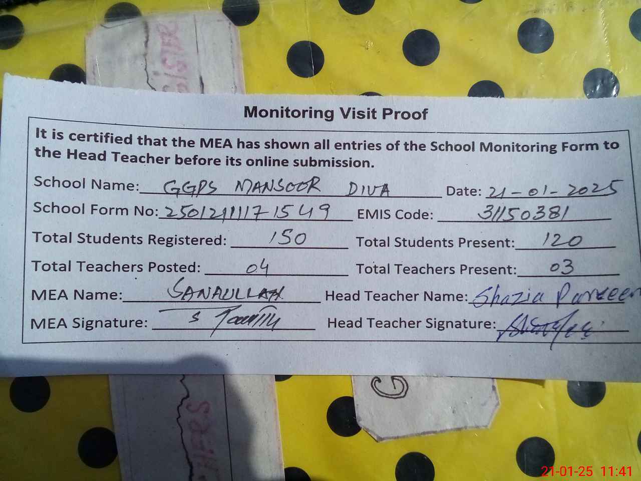 | Attendance Register | Head Teacher | MEA with School | Visit Proof |