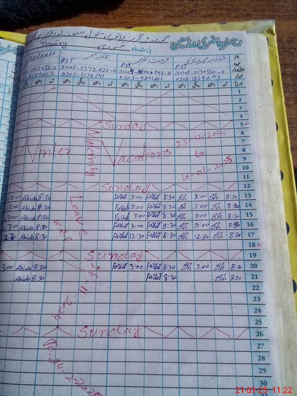 | CNIC | Full Name | Designation | R/C | Absence During Last Calender Month |