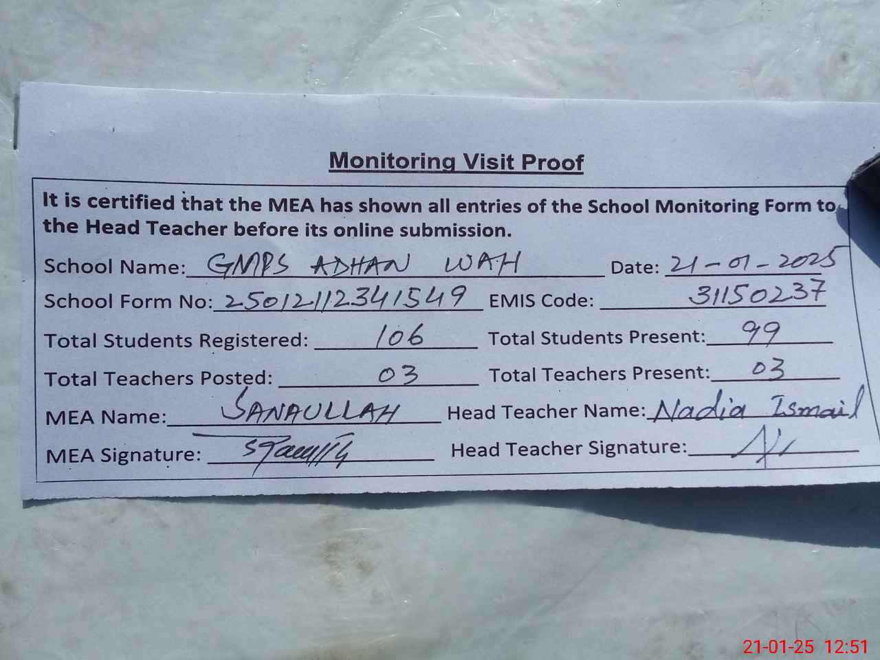 | EMIS Code: 31150237 | Name of School: GMPS ADHAN WAH | |||