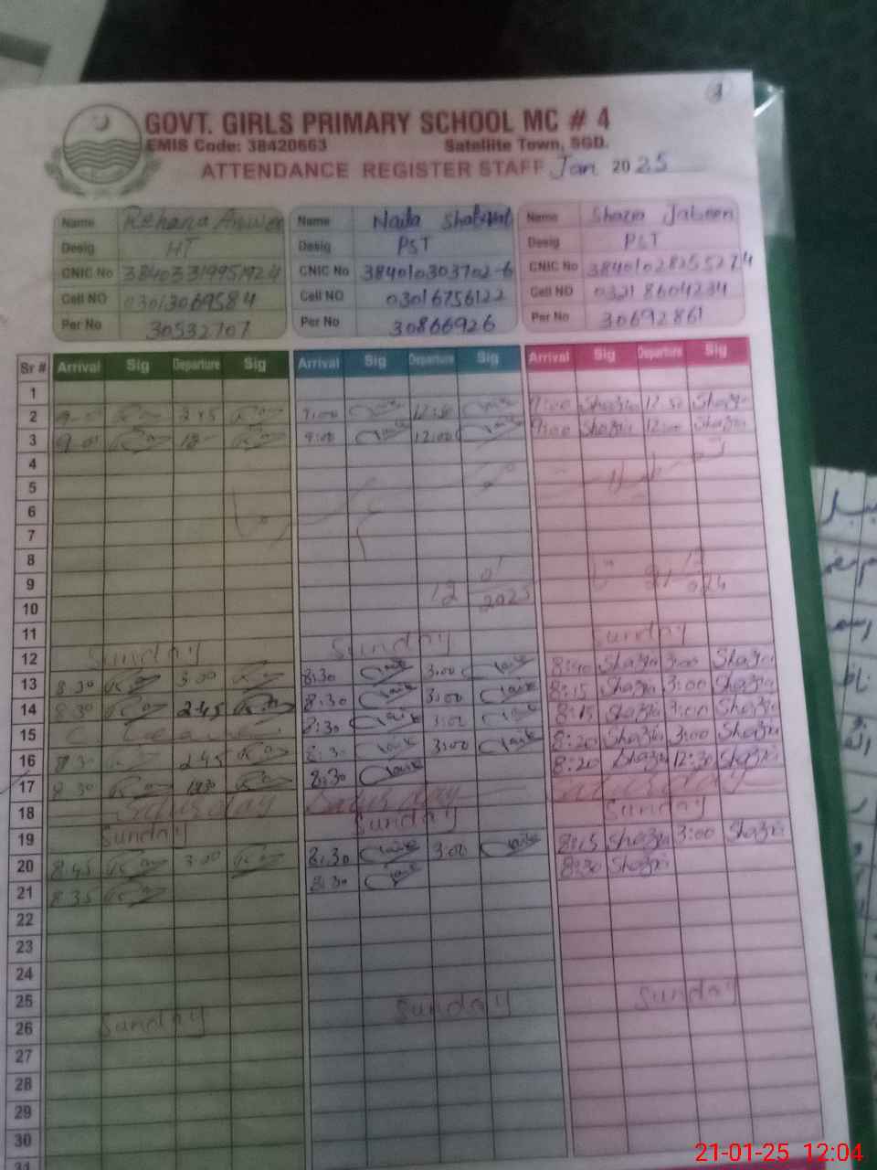| CNIC | Full Name | Designation | R/C | Absence during last cal. month |