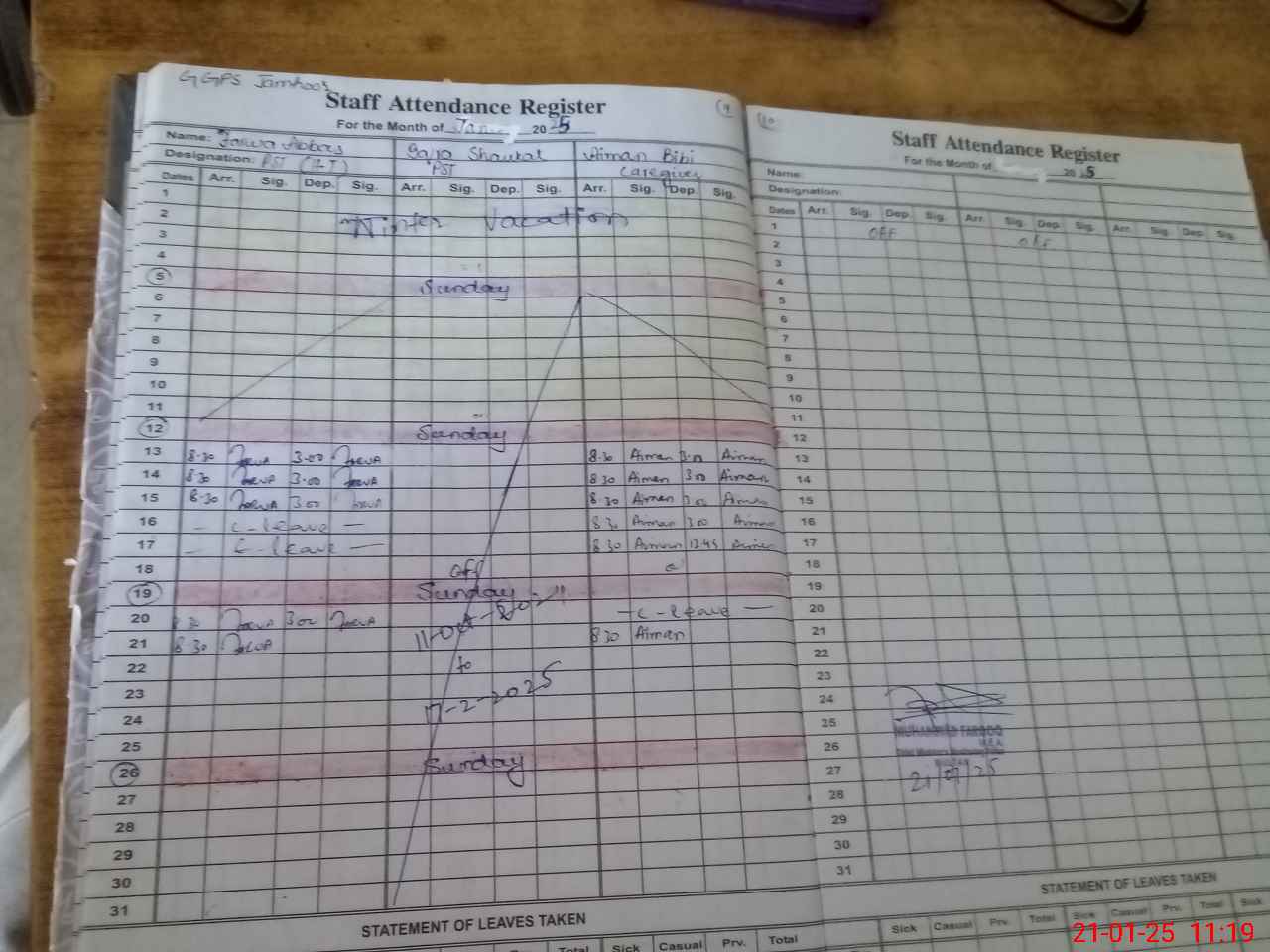| CNIC | Full Name | Designation | R/C | Absence During Last Calender Month |