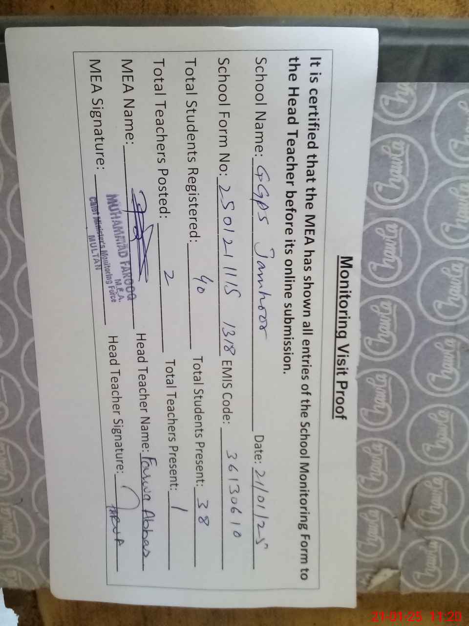 | Attendance Register | Head Teacher | MEA with School | Visit Proof |