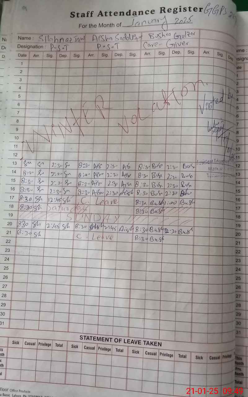 | CNIC | Full Name | Designation | R/C | Absence During Last Calender Month |