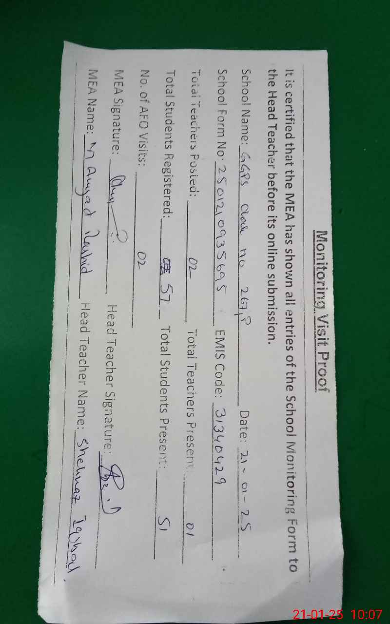 | Attendance Register | Head Teacher | MEA with School | Visit Proof |