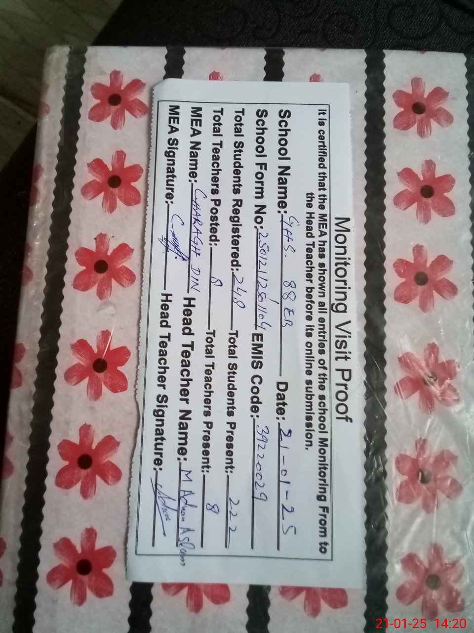| Attendance Register | Head Teacher | MEA with School | Visit Proof |