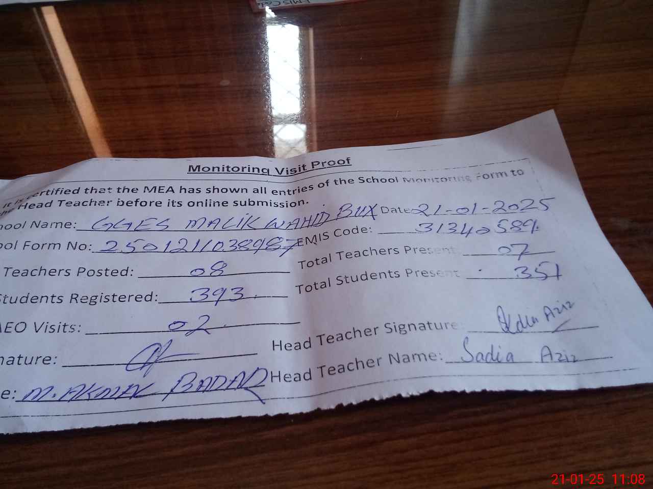 | Attendance Register | Head Teacher | MEA with School | Visit Proof |