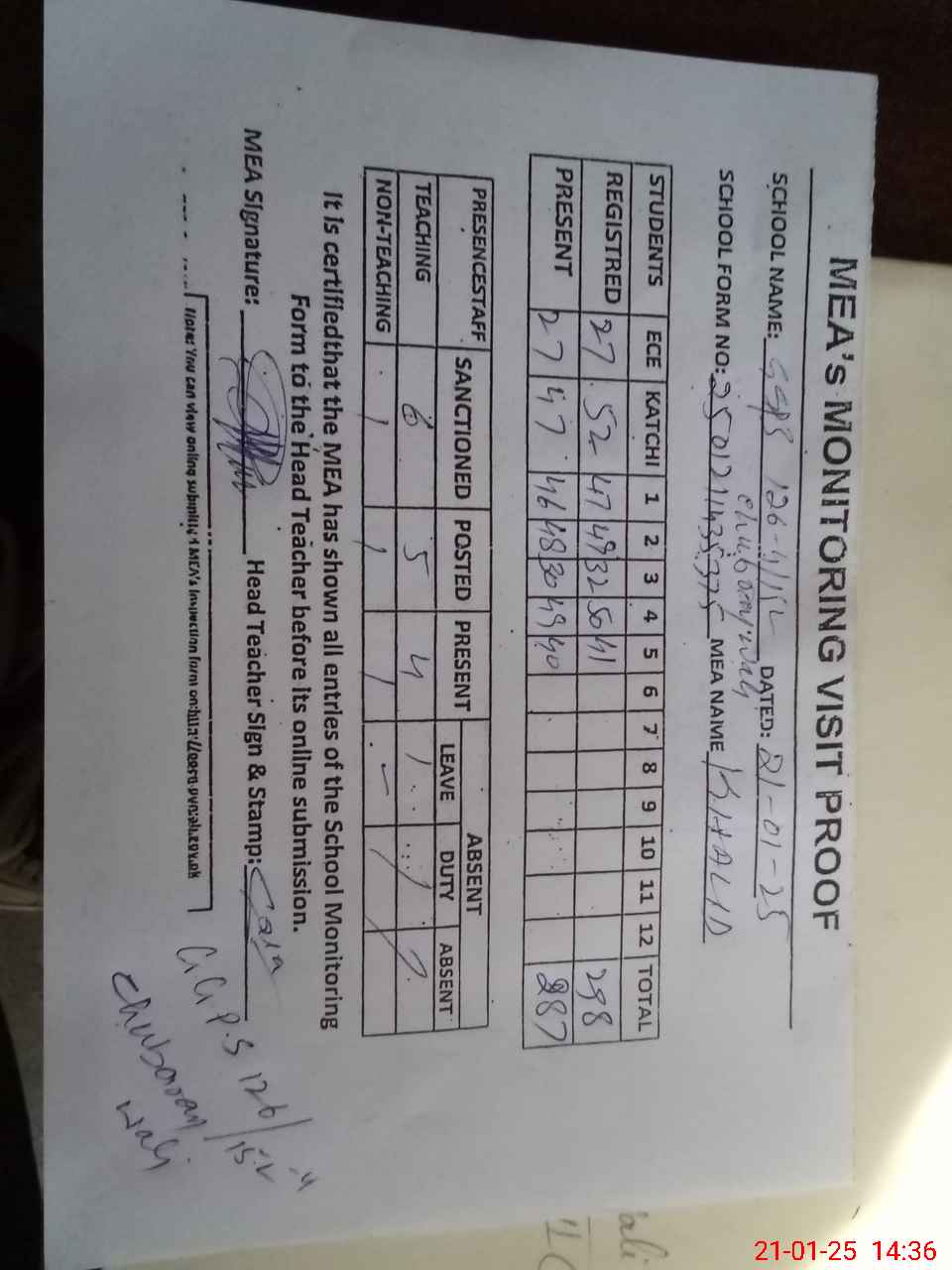 | Attendance Register | Head Teacher | MEA with School | Visit Proof |