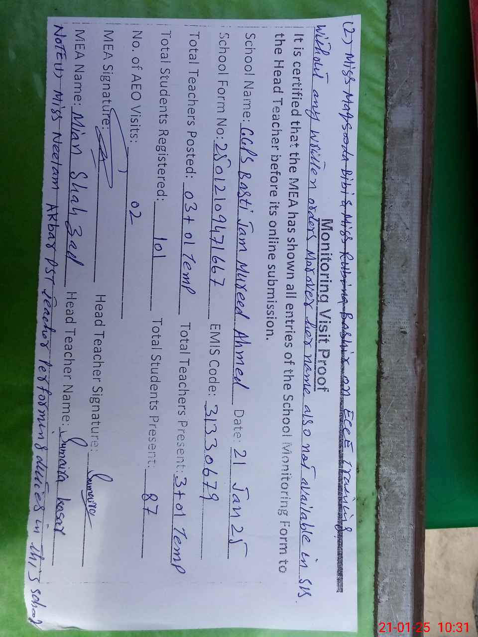 | Monitoring Date: 21-01-2025 | Start Time: 21-01-2025 09:31 AM | End Time: 21-01-2025 10:32 AM | Name of MEA: Sh**** Ah**** | |
