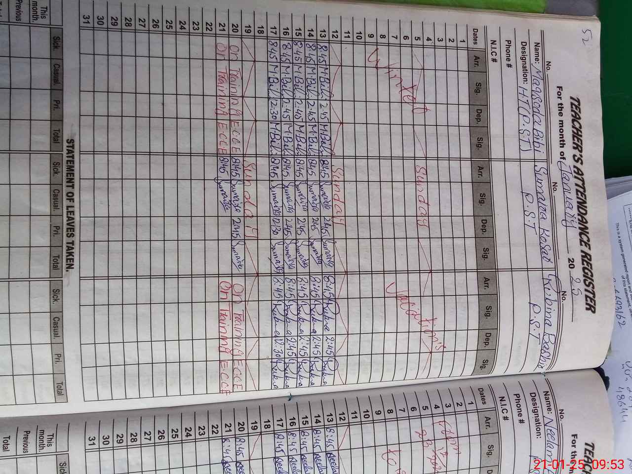 | Remarks (Use Separate Page if Required): 1 Miss Neelam Akbar PST teacher performing duties in this school with out any written orders moreover her name also not available in SIS 2 Miss Maqsooda Bibi and miss Rubina Bashir on ECCE training | |||||