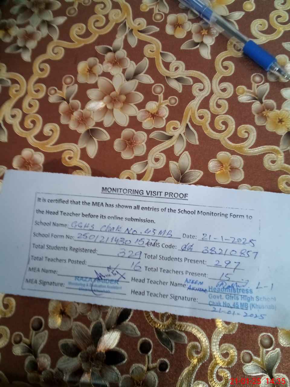 | EMIS Code: 38210857 | Name of School: GGHS CHAK NO 45 MB | |||