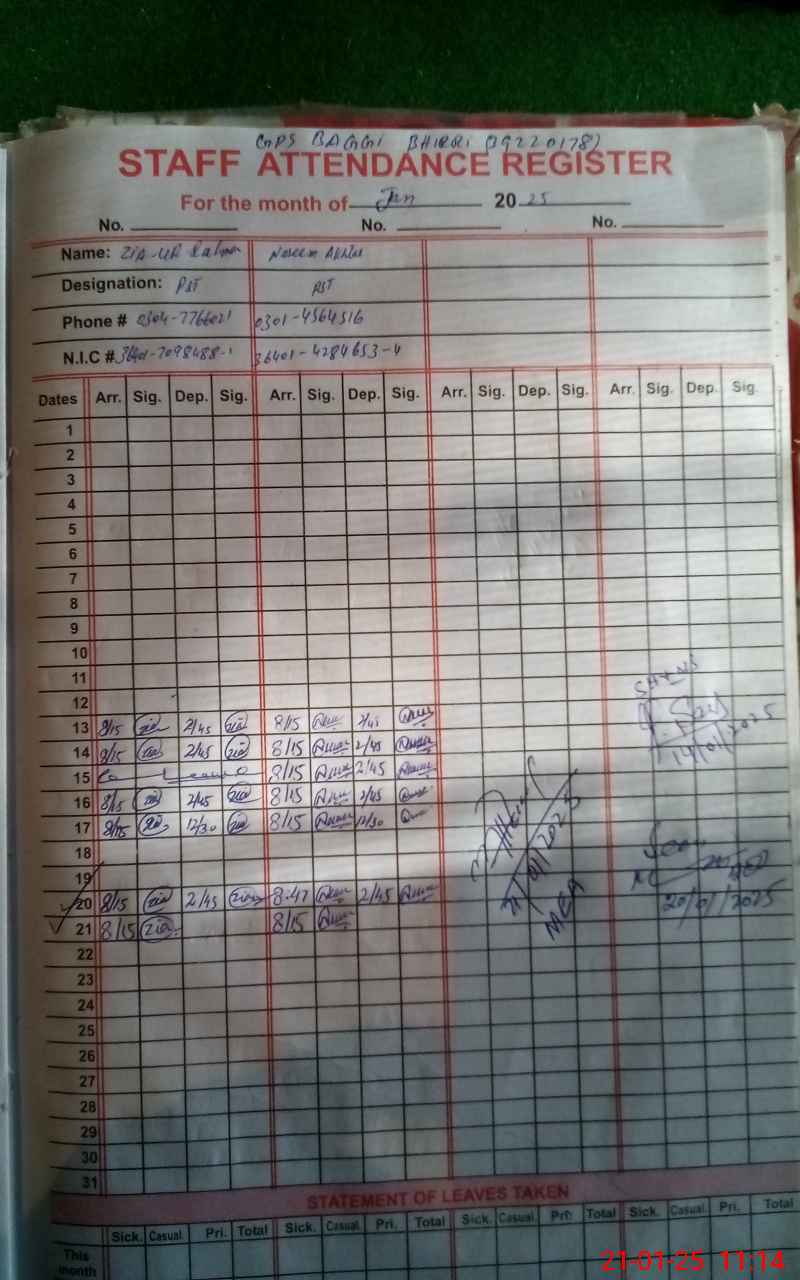 | Name: ZI**** URRE**** Designation: (School Headmaster's/Headmistress's) PST Phone/Cell Number: 03**** |