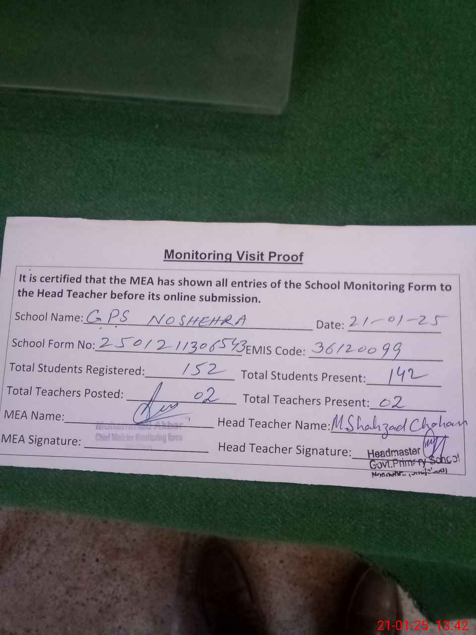 | Attendance Register | Head Teacher | MEA with School | Visit Proof |
