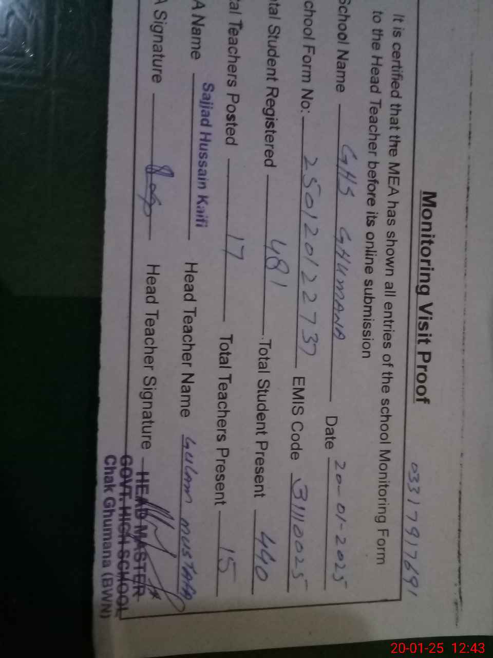 | Name: MU**** KH**** Designation: (School Headmaster's/Headmistress's) Headmaster Phone/Cell Number: 03**** |