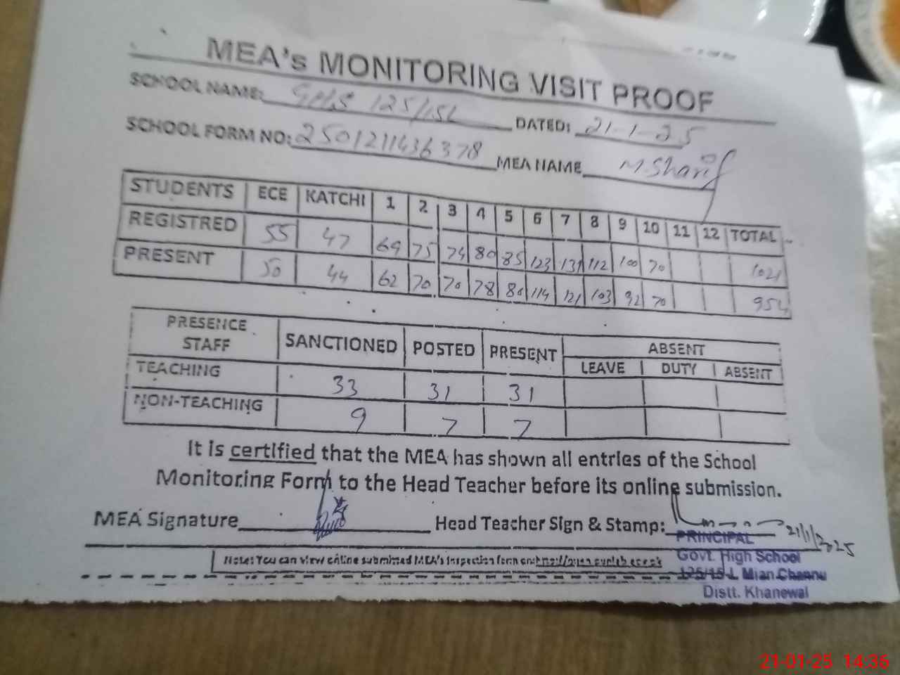 | EMIS Code: 36430019 | Name of School: GHS 125/15-L, MIAN CHANNU | |||