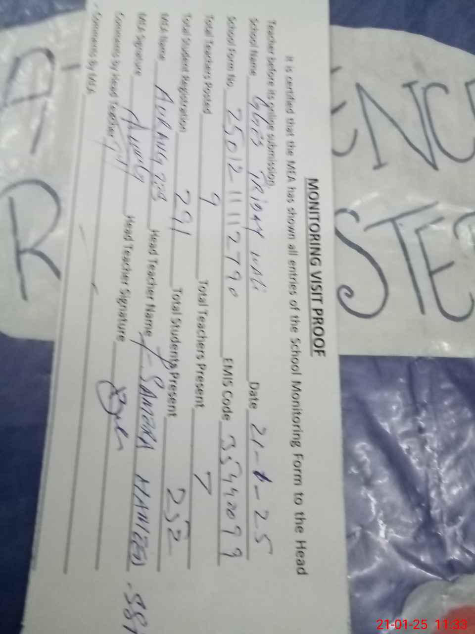 | Attendance Register | Head Teacher | MEA with School | Visit Proof |