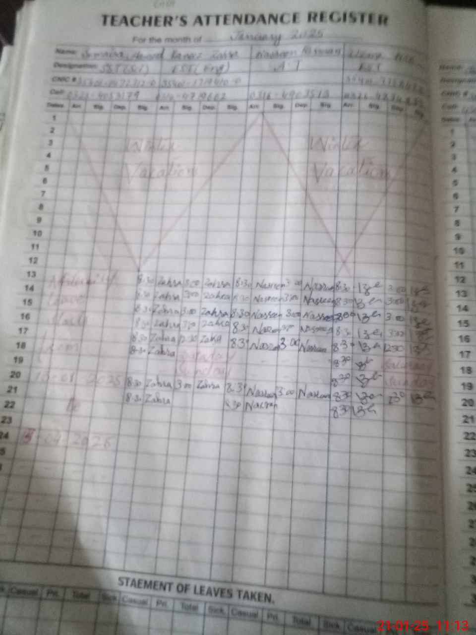 | CNIC | Full Name | Designation | R/C | Absence During Last Calender Month |