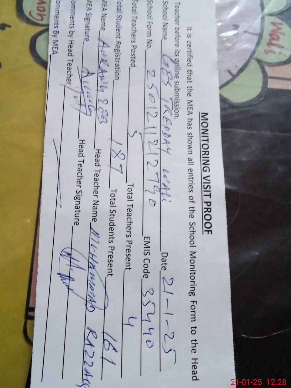 | Attendance Register | Head Teacher | MEA with School | Visit Proof |
