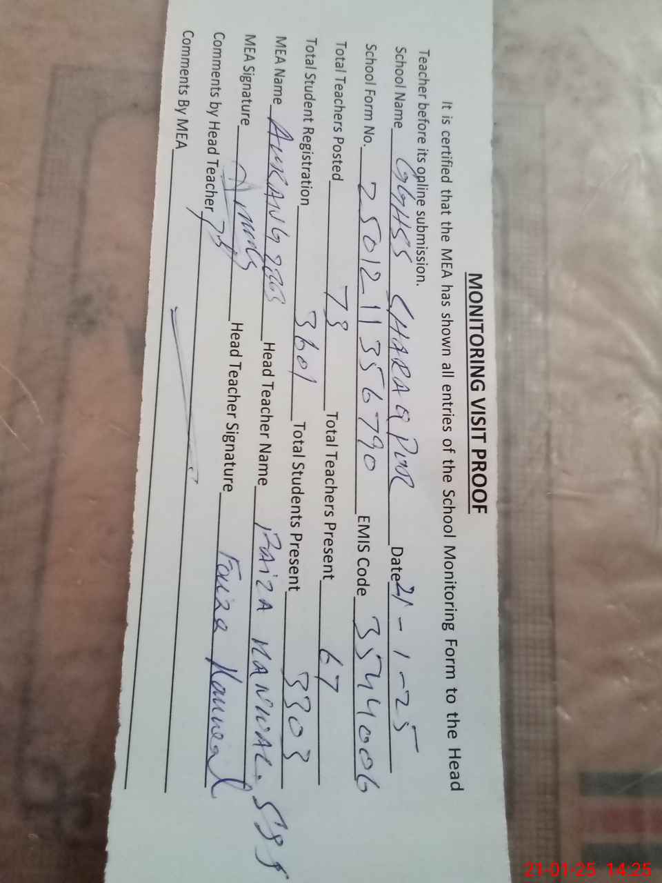 | Attendance Register | Head Teacher | MEA with School | Visit Proof |