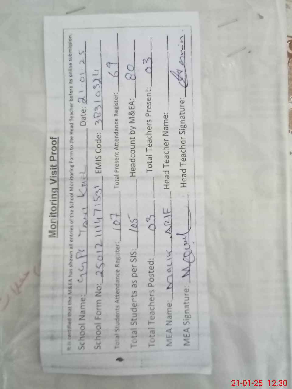 | Attendance Register | Head Teacher | MEA with School | Visit Proof |