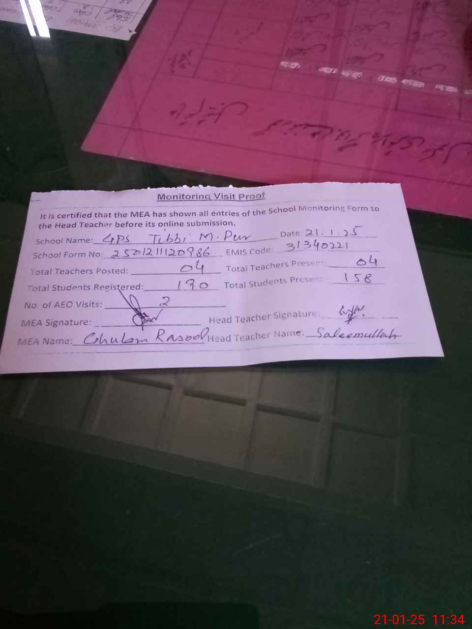 | Attendance Register | Head Teacher | MEA with School | Visit Proof |