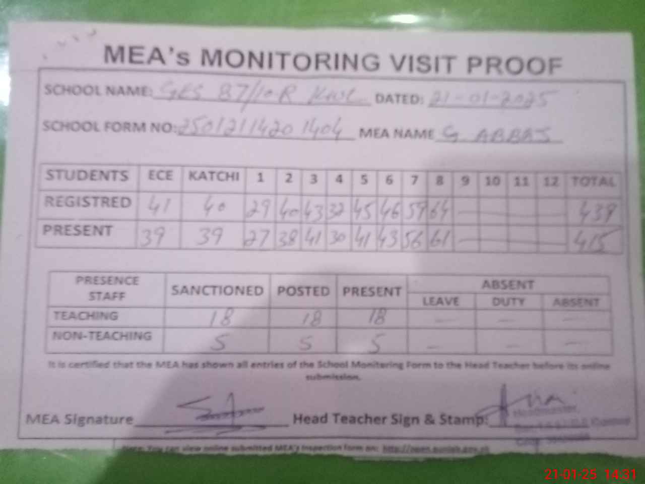 | Attendance Register | Head Teacher | MEA with School | Visit Proof |