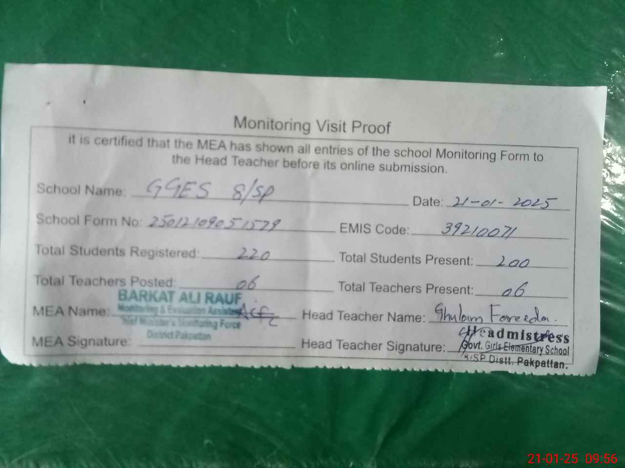 | Attendance Register | Head Teacher | MEA with School | Visit Proof |