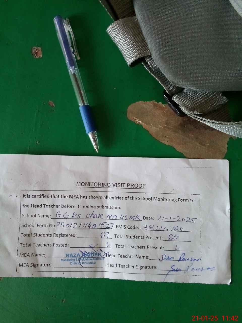 | Attendance Register | Head Teacher | MEA with School | Visit Proof |