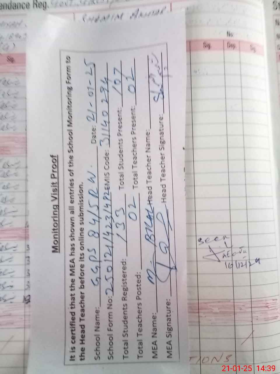 | Attendance Register | Head Teacher | MEA with School | Visit Proof |