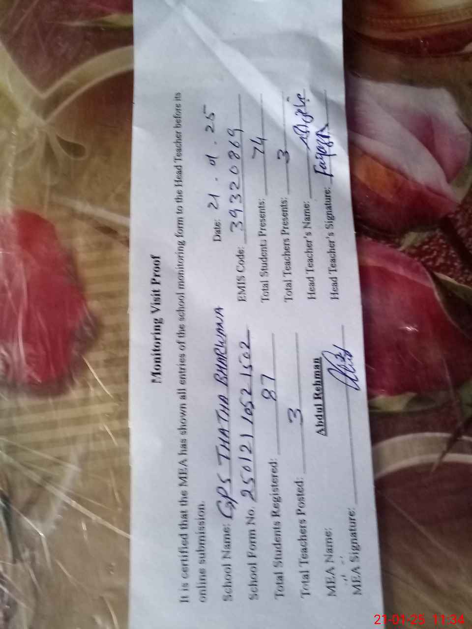 | Attendance Register | Head Teacher | MEA with School | Visit Proof |