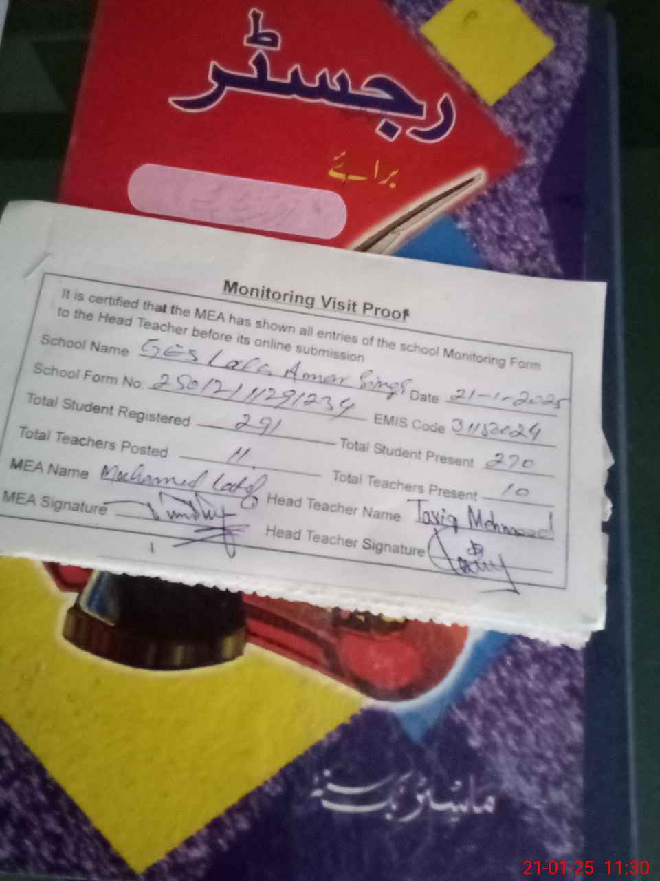 | Attendance Register | Head Teacher | MEA with School | Visit Proof |