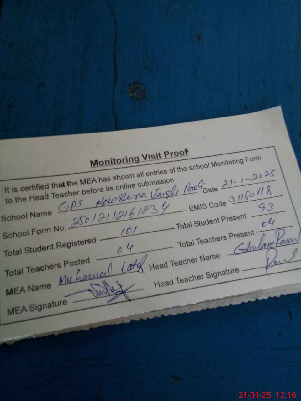 | Attendance Register | Head Teacher | MEA with School | Visit Proof |