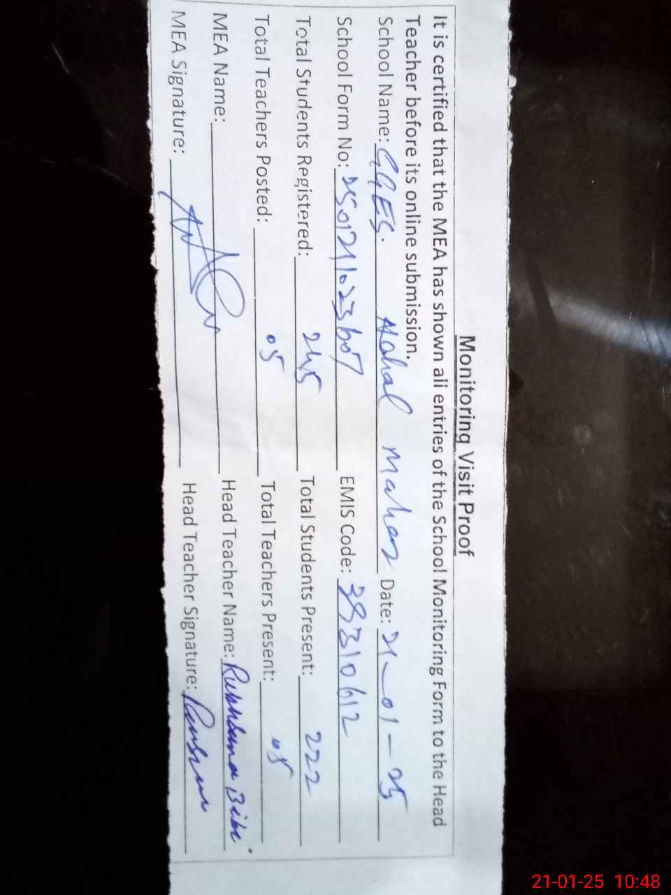 | Certified that this School was Inspected by the Undersigned MEA/DMO Today and the Information Stated Above is as Per Record. | |||||