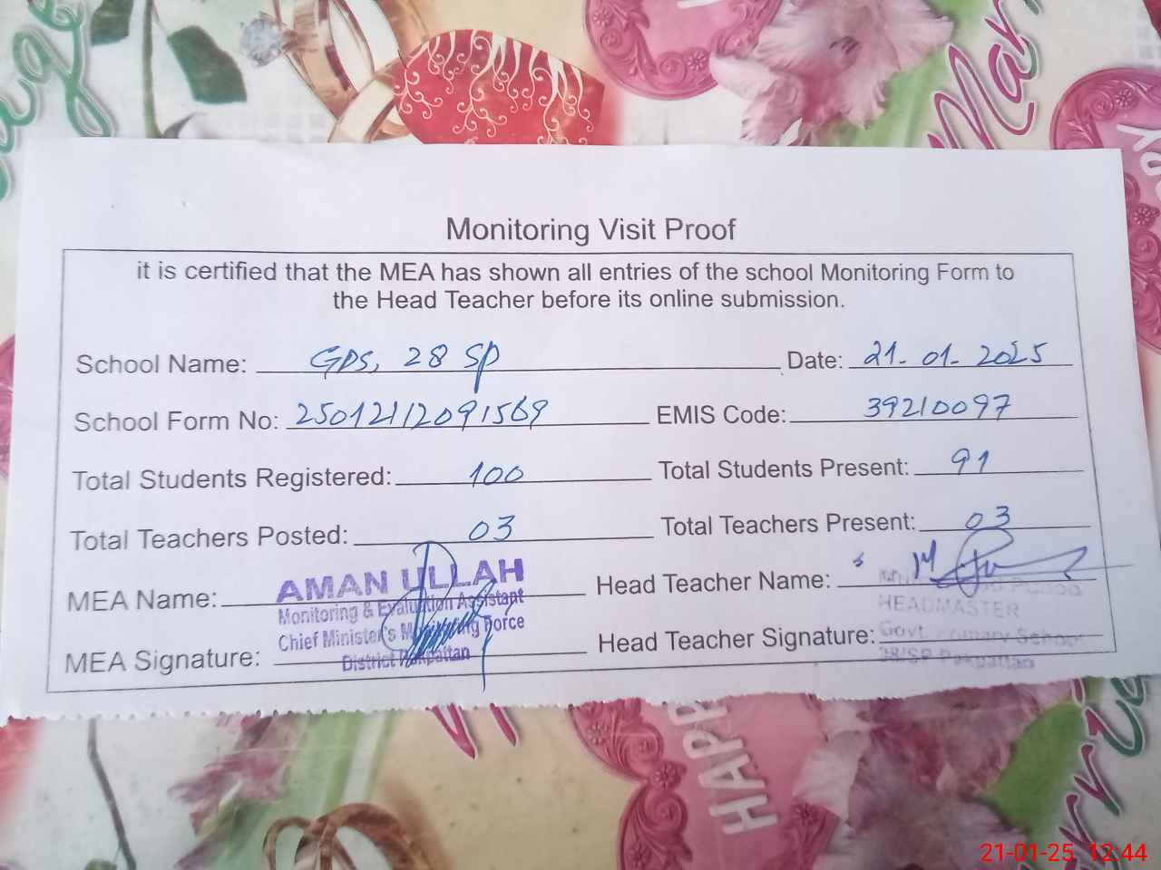 | Attendance Register | Head Teacher | MEA with School | Visit Proof |