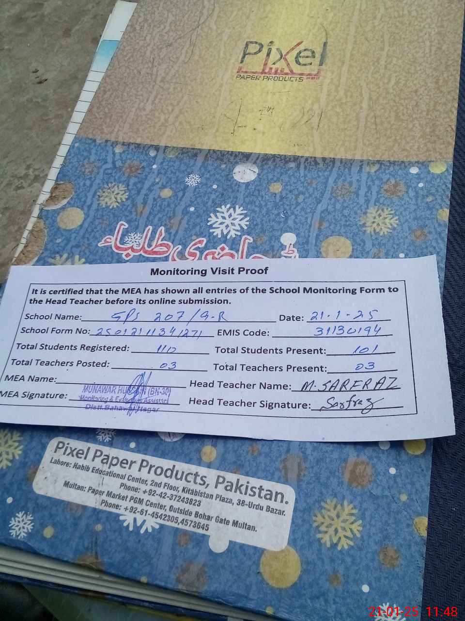 | Attendance Register | Head Teacher | MEA with School | Visit Proof |