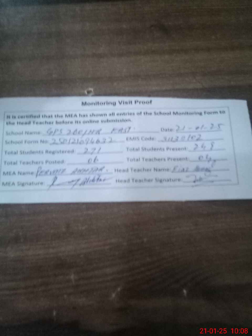 | Attendance Register | Head Teacher | MEA with School | Visit Proof |