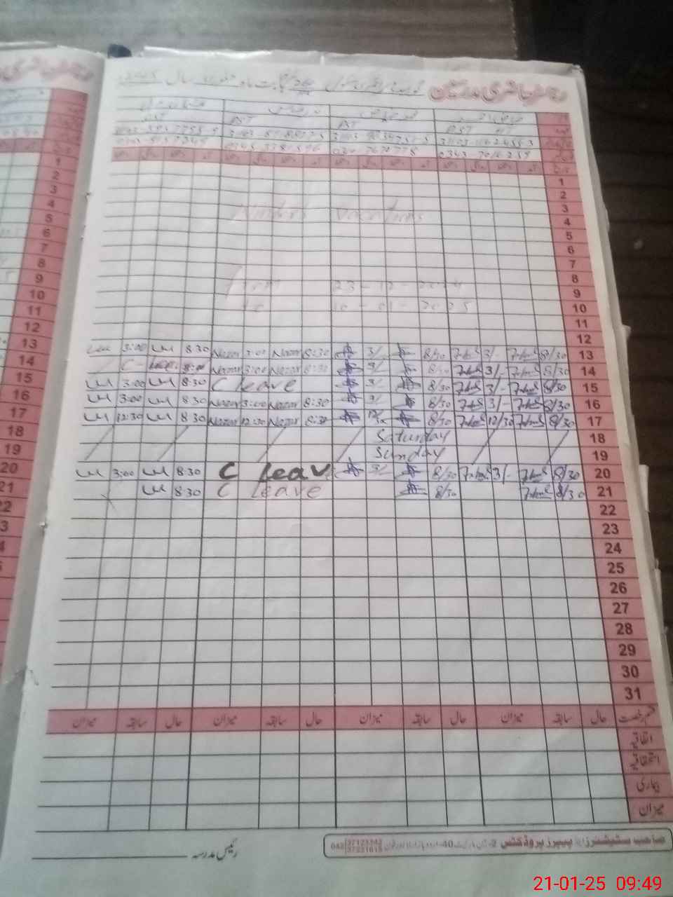 | CNIC | Full Name | Designation | R/C | Absence During Last Calender Month |